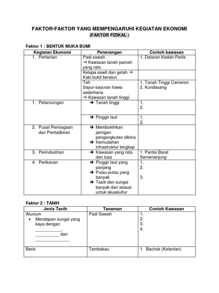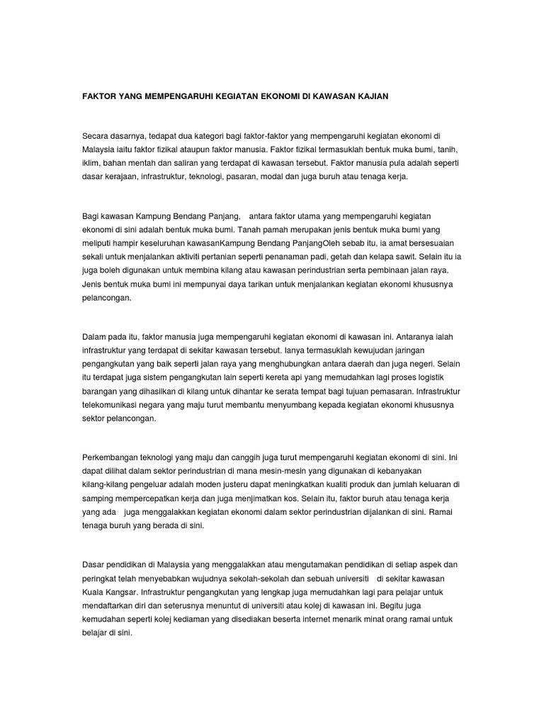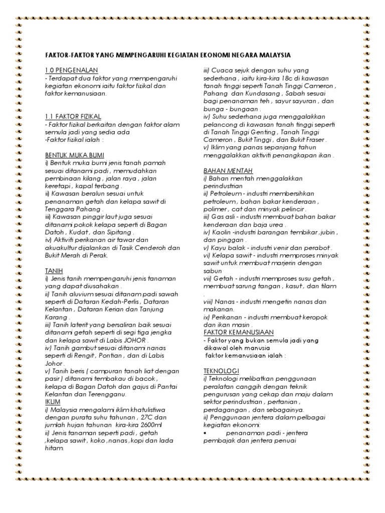 Mulai dari sumber daya alam, sumber daya manusia, sampai kemajuan teknologi berperan besar dalam merangsang pertumbuhan ekonomi. Dibawah adalah penerangan ringkas bagi unit 12 subjek geografi tingkatan 5. Inilah faktor utama yang mempengaruhi pembangunan dan pertumbuhan ekonomi. Faktor ekonomi mempengaruhi pendapatan atau laba rugi perusahaan, yang akhirnya akan mempengaruhi harga saham dan imbal hasil ekuitas. Studi ini ditujukan untuk menganalisis faktor yang mempengaruhi pertumbuhan ekonomi provinsi riau, dengan data sekunder dari tahun 1998 sampai dengan 2008 dan metode multiple regression.